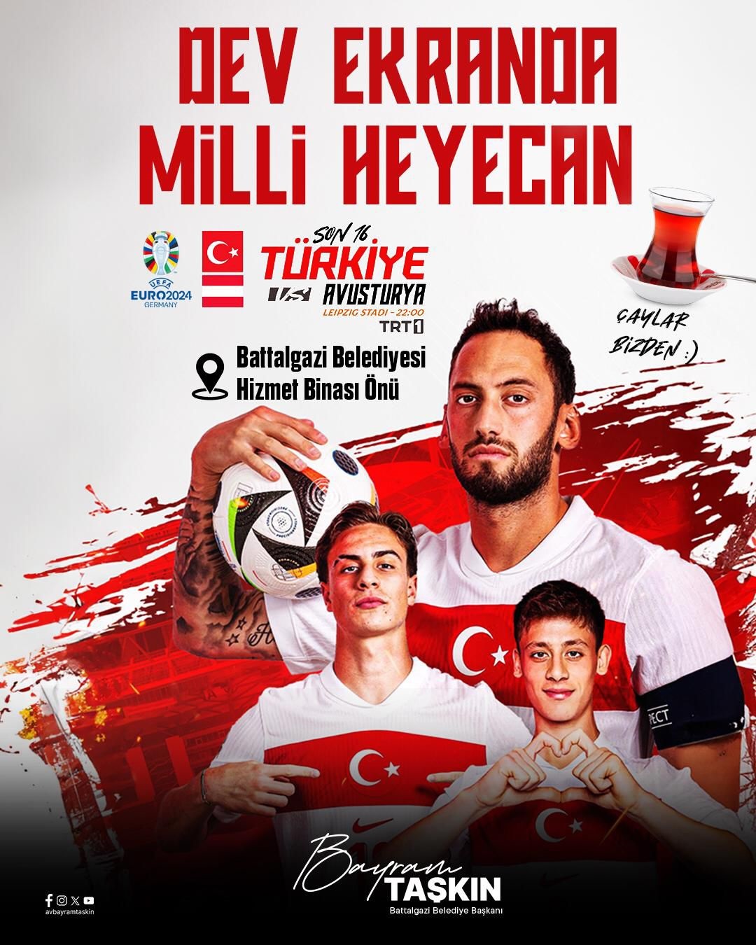 Bu etkinlik kapsamında, vatandaşlar açık havada toplu halde maç izleme keyfini yaşayacak. Battalgazi Belediye Başkanı Bayram Taşkın, “Milli takımımızın yanında olmak ve bu heyecanı hep birlikte yaşamak için tüm vatandaşlarımızı bu etkinliğe davet ediyoruz” dedi.